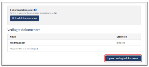 If there are parties who need to be attached to the power of attorney or other documents uploaded, it will be possible to upload attachments to the notification. Check the ”I attach power of attorney, because it is not possible to invite for digital signing. Please note, that if you attach a power of attorney, the documentation must be approved by the Ship Register.” Checkbox. Click "Save and verify. Click "Upload documentation".