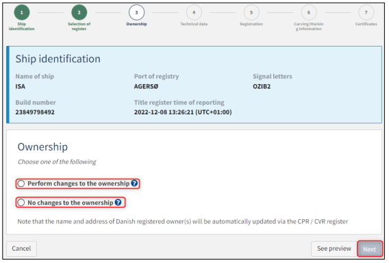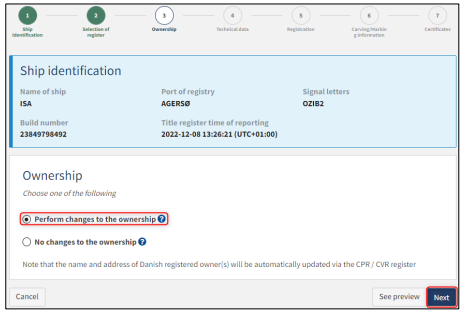If there are changes to the ownership, select "Perform changes to the ownership". If there are no changes to the ownership, select "No changes to the ownership". Click ”Next”.
