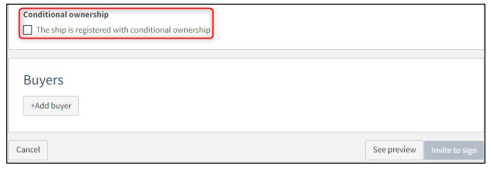 Step 3: Ownership If the ship is already owned by several parties and there are only sales between them, then a buyer should not be added. As soon as the number of parts in the ship across all owners sums up to 1/1, you can send invitations by clicking on "Invite to sign". If there is a new party that gets ownership shares in the ship on the basis of this sale, click on "+Add buyer".